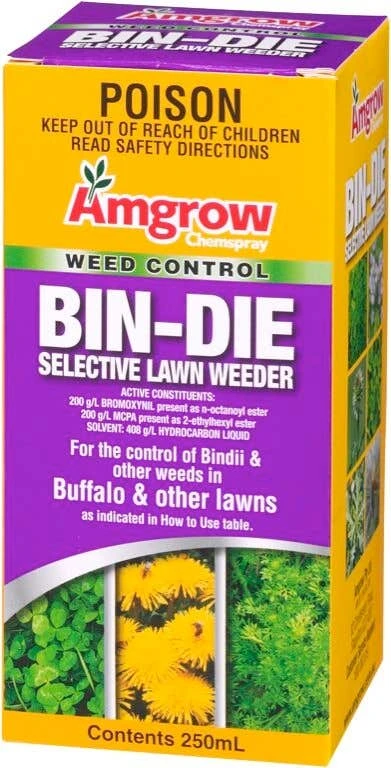 Amgrow Bin-Die Selective Lawn Weeder Concentrate is a selective herbicide that kills bindii, catsear, clover, creeping oxalis and other broadleaf weeds in your lawn. It will also control dandelions, plain thistle and other broadleaf weeds that occur in buffalo lawns. It has a high concentration which means a 250ml bottle will cover approximately 160 square metres of area.