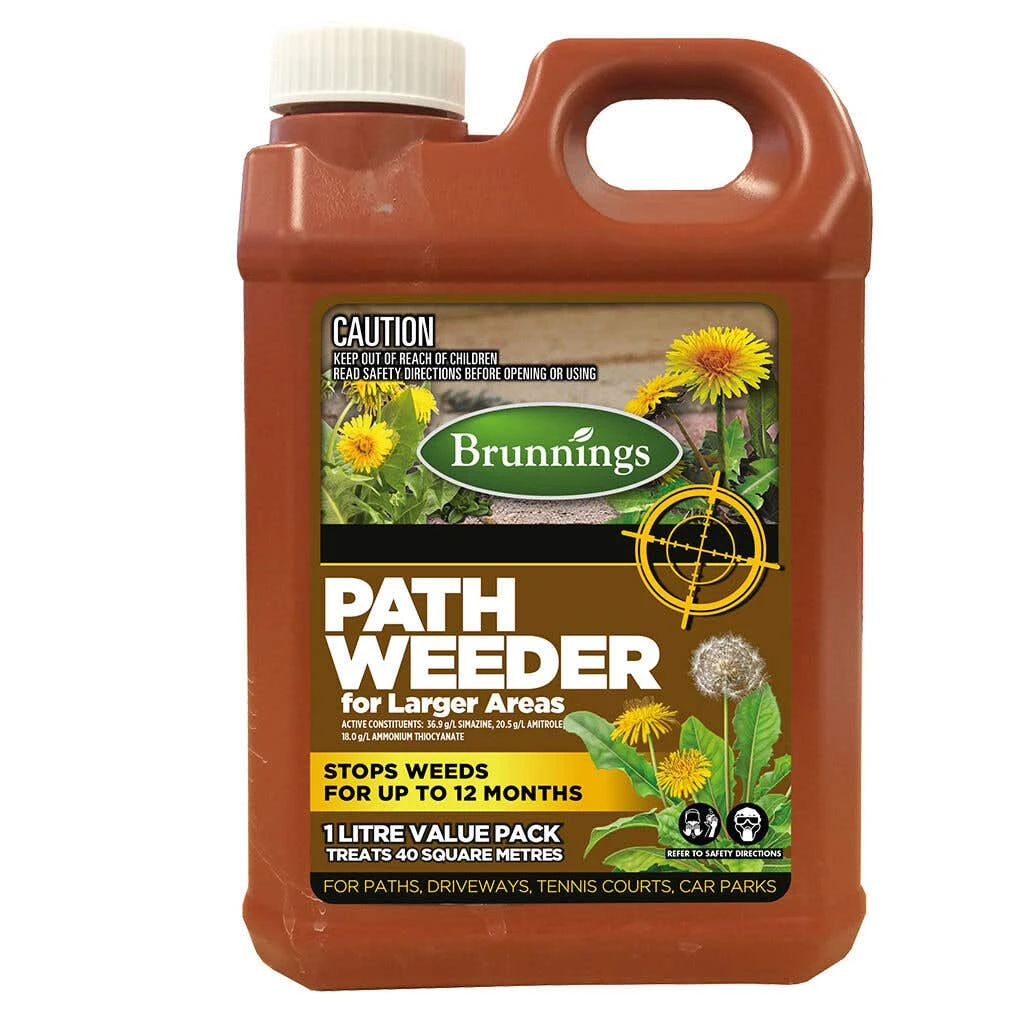 Brunnings Path Weeder Concentrate is ideal for killing and controlling most weeds and grasses on paths, driveways, tennis courts and car parks. Kills weeds within 3 to 4 weeks and remains present in the soil to prevent growth. Controls most weeds and grasses. When diluted will treat up to 40sqm.