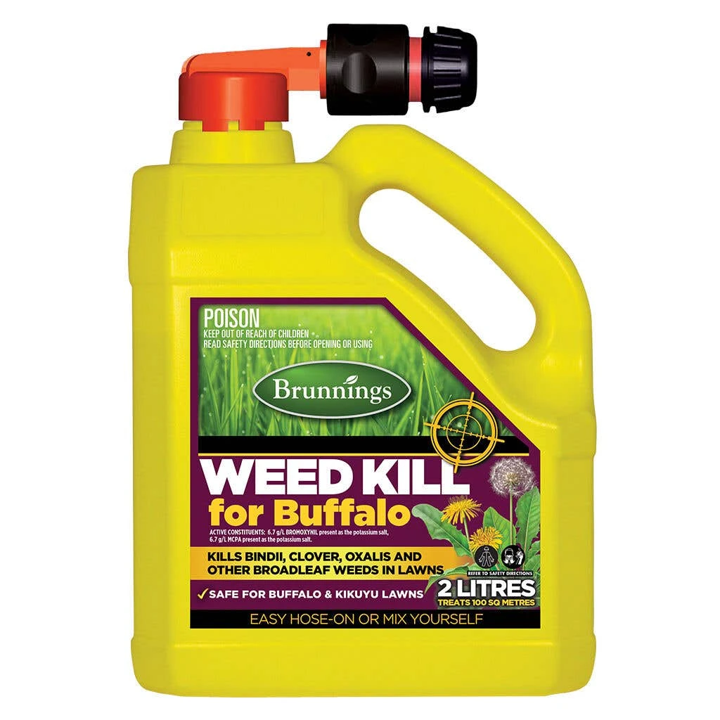 Brunnings Buffalo Lawn Weed Kill is safe to use on Buffalo and Kikuyu lawns and kills Bindii, Clover, Oxalis and other broadleaf weeds in lawns. The weed killer absorbs through the leaves of your lawn or garden and kills weeds over a period of 3 to 4 weeks. Treats up to 100m2 of lawn/garden so you can cover more area with less effort.