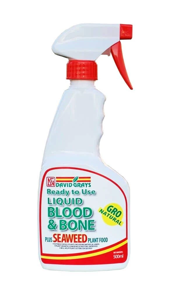 David Grays Blood & Bone with Seaweed is an organic liquid fertiliser that is rich in nutrients and contains natural seaweed. It offers your plants a great value for money, as it helps them to setup quickly meaning they need less maintenance than other products. This fertiliser can be used on all plants including natives and lawns. Suitable for all plants including natives and lawns, it promotes flowering, fruiting and plant growth.