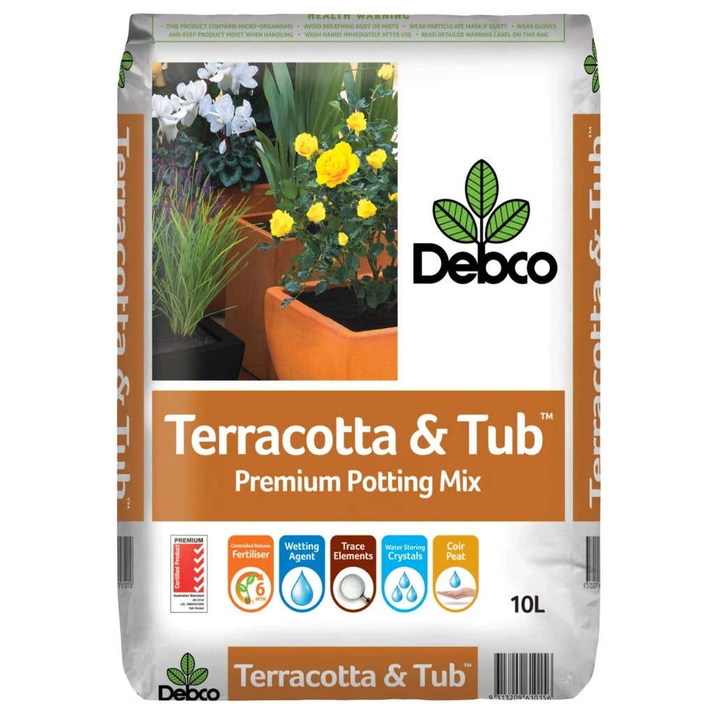 Debco Terracotta & Tub Premium Potting Mix what your plants need to thrive. This mix contains quality key additives to deliver optimal growth and has been specifically formulated for growing the broadest range of plants in tough conditions like porous terracotta pots, wooden tubs and hanging baskets.