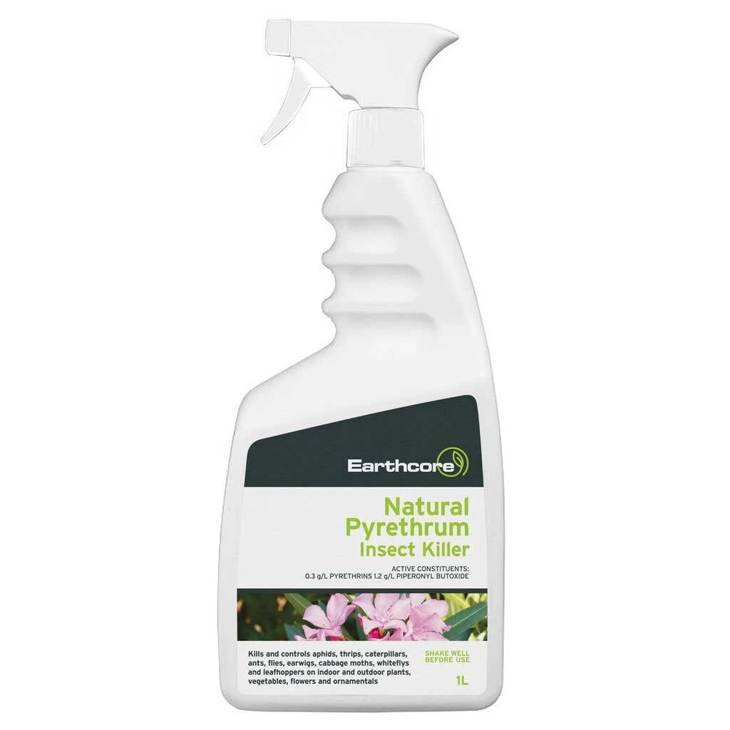 Earthcore Natural Pyrethrum is a ready-to-use garden spray that kills flying and crawling insects. It is natural, biodegradable, safe to use around the home and pets and will not harm the environment. The Natural Pyrethrum formula effectively kills mosquitoes, Fleas, Flies, Ants, Spiders, Aphids, Lace Bugs, Millipedes, and many other common pests in the garden or around the home. This ready-to-use Pyrethrum insect killer is suitable for use on vegetables, flowers and ornamentals. Applied as a spray, it will kill and control insects such as aphids, whitefly and mealybug on ornamentals and vegetables.