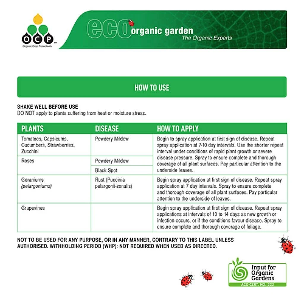 OCP eco-fungicide is a registered organic fungicide for the control of powdery mildew, black spots and rust in many plants including tomatoes, zucchini, roses, grapevines and geraniums. It rapidly attacks existing infections and creates a protective barrier against new outbreaks. Eco-fungicide is a contact spray so good coverage is essential to obtain the best results. Made from food-grade ingredients, it is safe to use on edible plants and has no withholding period.