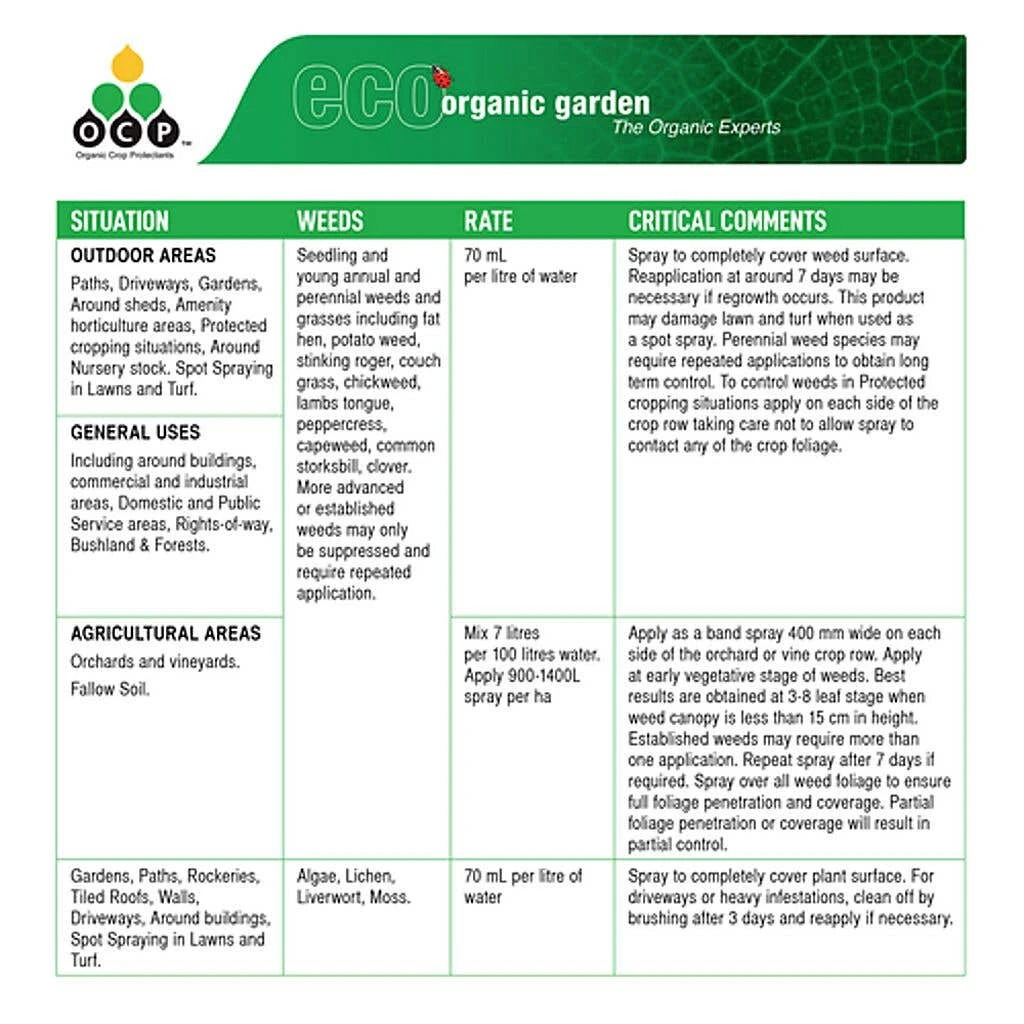 OCP Slasher Organic Weedkiller kills a broad range of weeds as well as moss, algae and lichen. It is non-selective and works on contact to rapidly desiccate and burn weeds. Visible results are seen within 1 hour on most weeds. Use anywhere around the house including garden beds, veggie patches, paths and driveways. OCP Slasher Organic Weedkiller is glyphosate-free.
