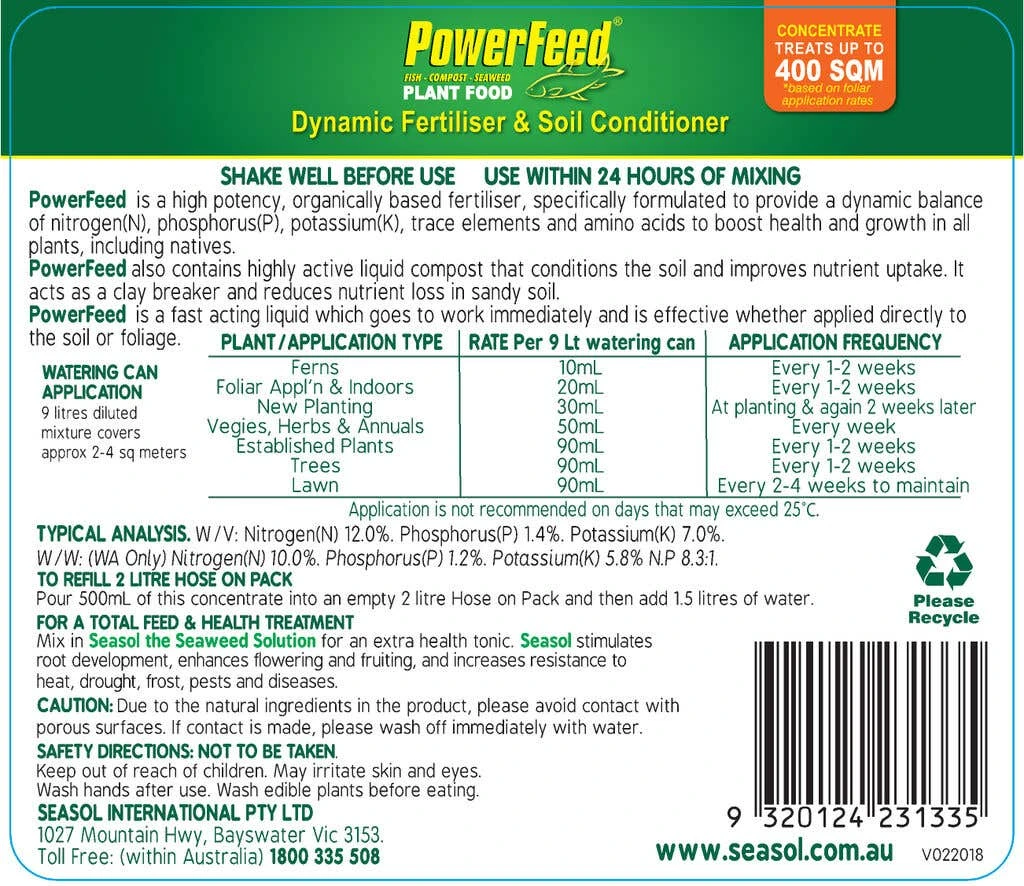 PowerFeed All Purpose including Natives, is a unique formula that combines the benefits of macronutrients, fish and natural soil conditioners. It boosts plant growth and vigour, promotes flowering and fruiting by providing nitrogen, potassium, trace elements, protein and amino acids. It also contains liquid composts, which stimulate beneficial soil microbial activity, promote good soil structure and increase nutrient availability, so it looks after plants above and below the ground.