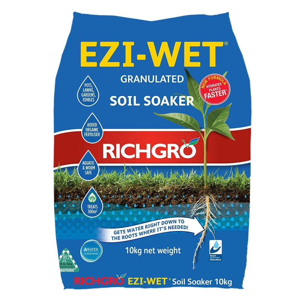 Richgro Ezi-Wet Granulated Soil Soaker 10Kg is a specially formulated granulated soil wetter designed to improve soil penetration and retention of moisture in the soil. It contains a unique blend of wetting agents and soil conditioners that work together to help water penetrate deeper into the soil and remain there longer. This product is ideal for use in dry, sandy soils or areas with low rainfall.