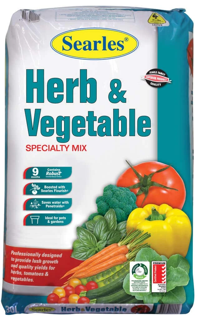 Searles Herb & Vegetable Specialty Mix is especially formulated for growing many types of herbs & vegetables. It is a professional blend of organic ingredients including peat moss, premium compost, + Searles Flourish Soluble Plant Food, Searles Robust Controlled Release fertiliser, Searles Water Crystals, Searles Penetraide and zeolite. The extra Premium Compost adds that necessary organic enrichment, nutrients and nutrient storage capacity, while peat moss and water crystals produce greater water and nutrient retention. An ideal combination for growing herbs & Vegetables in pots and containers, for in-bag growing and garden beds.