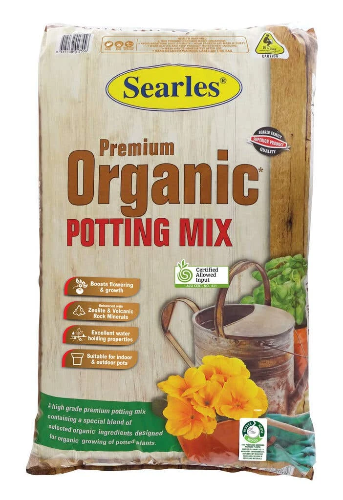 Searles Premium Organic Potting Mix is a high-grade premium potting mix containing a unique blend of selected organic ingredients, designed for sustainable and organic growing of potted plants. Formulated for excellent water retention properties while also allowing ideal drainage, providing the right conditions for your loved plants. This mix contains sufficient organic fertilisers for up to 1 month of plant growth, after which time we suggest an organic fertiliser such as SeaMax Organic Fertiliser for further nutrient supply.