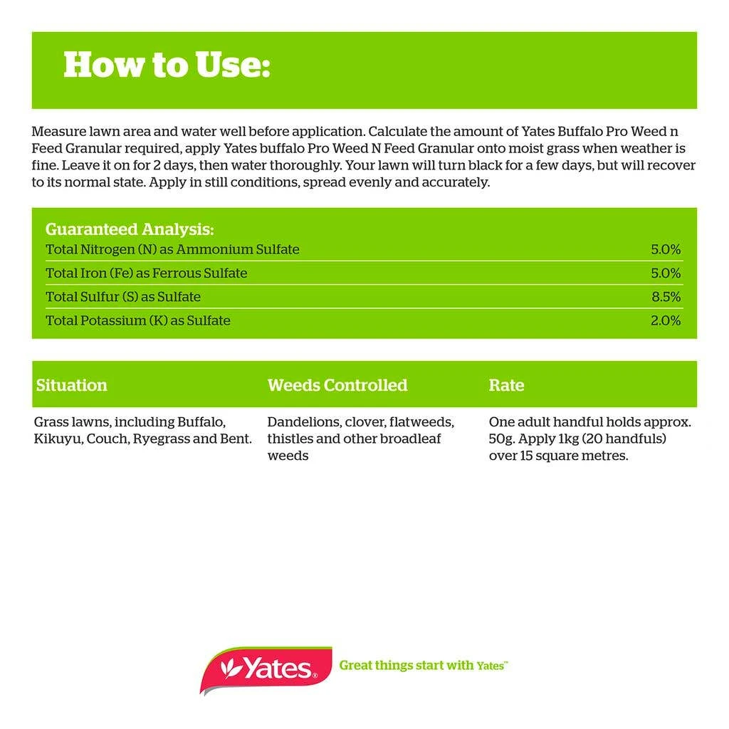 Ready to spread BuffaloPro Granular Weed ’n ’Feed kills weeds in your lawn and feeds the lawn at the same time. BuffaloPro Granular Weed ‘n’ Feed contains soluble iron and soluble nitrogen for fast greening. The soluble iron also acts as a burning agent for control of the broadleaf weeds. For best results, water the lawn before applying and then water in two days after application.