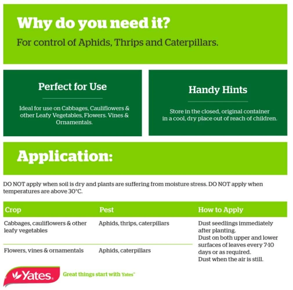 To use Nature’s Way Vegetable Dust Derris 500g, simply apply the dust directly onto the leaves and stems of the affected plants using a dust applicator or shaker. The dust will be absorbed by the insects and will cause them to stop feeding and die.