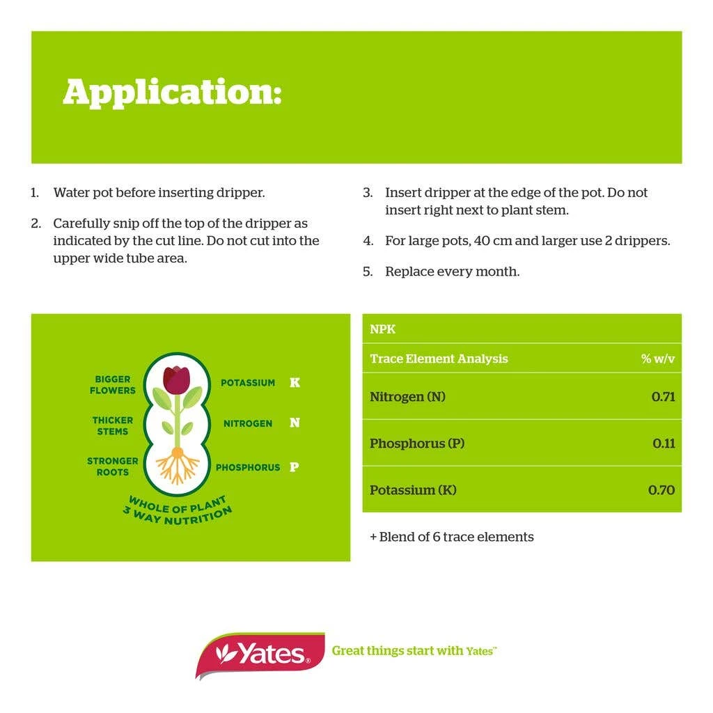 30mL Thrive Indoor Plants And Ferns Drippers are a ready to use, specially formulated plant fertiliser, designed to help you easily feed your indoor plants. 30mL Thrive Indoor Plants And Ferns Drippers provides a gentle feed for healthy leaves and flowers. Each dripper contains the right NPK balance to feed your indoor plants for 4 weeks. To use the dripper, simply snip off the tip of the dripper and insert into the potting mix of your pot plant. Push, feed and forget – To use the dripper, simply snip off the tip of the dripper and insert it into the potting mix of your pot plant.