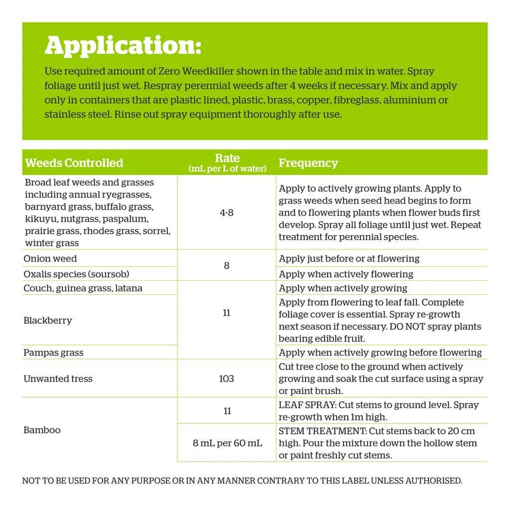 Zero Weed Killer is for non-selective control of all grasses and broadleaf weeds, as well as onion weed, bamboo, lantana, blackberry and unwanted trees. It provides effective, economical and easy control of weeds and grasses in rockeries, garden beds, paths, driveways, along fence lines and lawn edges. Zero Herbicide is perfect for clearing garden beds before planting and clearing areas prior to planting new lawns.